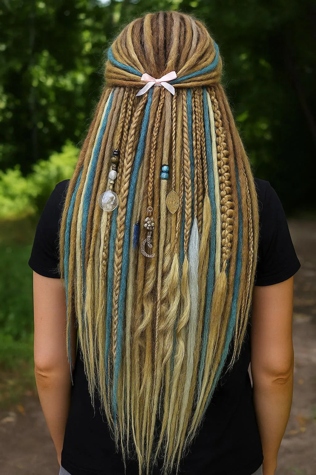 This boho fake dreads set in blonde & blue combines natural blonde tones with cool blue accents and soft loose ends. These boho synthetic dreads are designed for movement, texture, and effortless festival-inspired styling, while staying lightweight and comfortable for everyday wear.