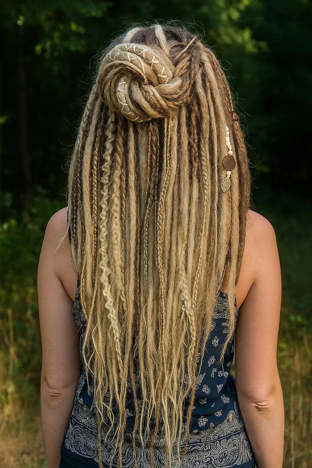 Elevate your look with these boho fake dreads in a Dirty Blonde + Dark Blonde Double Ended (DE) synthetic dreads and braids mix. Lightweight, natural-looking, and perfect for festivals, parties, or everyday styling.