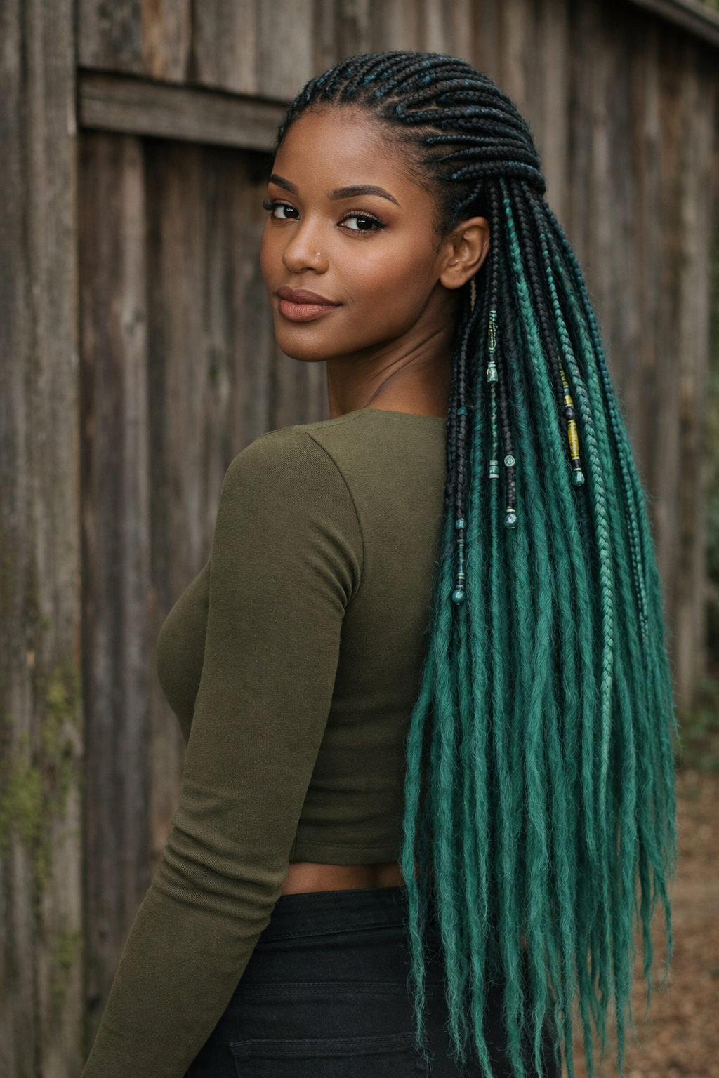This black to emerald green ombre double ended set features a dramatic gradient from deep black roots to rich jewel-tone green. The smooth transition creates bold contrast while keeping the look refined. The set includes both dreadlocks and braids for added texture and dimension.